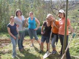 Buon Dia zu unserem ersten ganzen Arbeitstag in Portugal. Gestärkt durch blaue, grüne und weisse Zöpfe, ausgerüstet mit dem letzten Schrei in der Arbeitskleidermode, motiviert durch herrliches Wetter, aktiviert durch eine gemeinsame Joggingrunde um die Quinta und aufgeteilt in verschiedene Arbeitsgruppen legen wir los wie die Wilden. Da wird eine Mauer gebaut, dort wird ein Feld gerodet, hier ein Hag aufgestellt und drüben Bäume gefällt.
