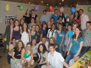 Um 19h00 wartete das Abendessen auf uns, es gab Kartoffelgratin, Bratwurst, Karotten und Salat. Nachdem wir gegessen hatten, war das Abendprogramm an der Reihe. Fünf verschiedene Gruppen mussten gegeneinander antreten und Punkte in diversen Spiele zu sammeln. Alles war dabei: Nägel einschlagen, mit Spaghetti stricken, ein Theaterstück vorführen, ein Diktat schreiben usw. Nach der lustigen Unterhaltung bekamen wir noch Kuchen und dann war freier Abend, und um halb Mitternacht dann Nachtruhe.