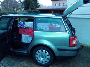 Als wir mit Annika auf der Autobahn nach Tolochenaz fuhren, haben wir uns zuerst gewundert, warum die Insassen mancher überholenden Autos uns so komisch ansahen. Jedoch ist uns schnell eingefallen, dass man nicht jeden Tag ein Auto überholt, das bis zur Decke mit schönen Päckchen beladen ist. Vielleicht dachten die Leute, der Weihnachtsmann würde am Steuer sitzen 🙂