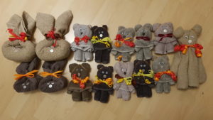 Leider waren wir dieses Jahr nicht besonders viele für die Marktvorbereitungen, denn viele waren während dieser Zeit in den Herbstferien oder hatten anderes zu tun. Deshalb war ich enorm dankbar, um die Hilfe einer ehemaligen JG-lerin, welche mich extra aus der Deutschschweiz besuchen kam. Wir malten Bilder und bastelten Tiere aus Waschlappen. Am darauffolgenden Dienstag waren wir glücklicherweise etwas mehr Leute und so machten wir Bretzelis aber auch gebrannte Mandeln.